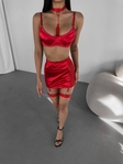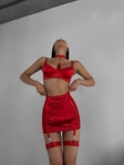 Незрівнянний комплект підкорюючи з першого погляду. М’яка чашечка, бюст на кісточках, шлейки з регуляторами. Трусики з відкритим доступом , спідниця, ремінці та чокер входять до комплекту.