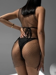 Ця сіточка повністю прикрашена камінням – вони міцно тримаються у спеціальній фурнітурі. Сіточку можна носити як туніку на пляжі, а також як додатковий елемент до сукні. З боків сіточка з'єднана ниткою - яку можна розпустити і зробити собі розрізи по доках. Лімітована колекція – таке знайти просто нереально – будь ексклюзивна. На фото купальник модель 2881/59.