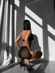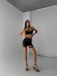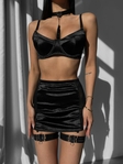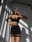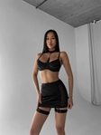 Незрівнянний комплект підкорюючи з першого погляду. М’яка чашечка, бюст на кісточках, шлейки з регуляторами. Трусики з відкритим доступом , спідниця, ремінці та чокер входять до комплекту.