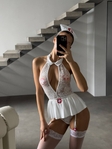 Комплект, який створений, щоб розпалити інтерес та вразити вашу половинку 💋✨Мереживне боді з глибоким вирізом, міні-спідничка, обруч і наліпки на груди формують сет, який виглядає максимально привабливо та сміливо. Підв’язки для панчох додають грайливості та завершують сексуальний образ. Панчохи у продажі окремо.
