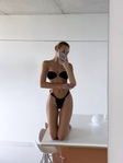 Сексуальне бікіні з металевою фурнітурою — сучасна класика з відтінком розкоші. Ліф-бандо та трусики з високою посадкою прикрашені елегантними металевими кільцями золотистого кольору, які надають образу розкішного блиску. Еластична тканина забезпечує щільну посадку та комфорт під час руху. Чашка має зйомні паралонові вкладиші.