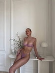 Ніжний мереживний комплект у витонченому рожевому кольорі. Бюстгальтер з формованими чашками на кісточках красиво підкреслює груди, а трусики-стрінги додають образу жіночності та легкості. Ідеальний варіант як для особливих моментів, так і на кожен день.