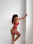 Розкрийте свою чуттєвість та привабливість у розкішному червоному комплекті. Ніжне мереживо з квітковим орнаментом, витончені вирізи та акцентні ремінці формують спокусливий силует, що приковує погляди. У набір входять бюстгальтер, стрінги, пояс для панчох з регульованими підв’язками та стильний аксесуар на шию.