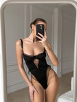 Це боді виглядає просто феноменально! Відкрийте для себе приголомшливе поєднання приємної до тіла тканини та розкішної декоративної сітки. Шлейки з регуляторами, по низу на застібці.