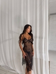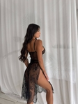 Витончений мереживний пеньюар, що поєднує ніжність і сексуальність. Прозора тканина з квітковим візерунком елегантно підкреслює силует, роблячи образ неймовірно привабливим. До комплекту входять мереживні трусики.