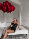 Чорна напівпрозора сорочка з пір’ям і стразами – створена для магнетичної спокуси та елегантної розкоші 🖤 Блискучі стрази мерехтять при кожному русі✨Ніжна обробка пір’ям по бюсту створює грайливий та водночас вишуканий акцент. Напівпрозора тканина додає пікантності, залишаючи місце для уяви, а розрізи збоку роблять модель ще більш звабливою.Трусики в комплекті, бюстик на кісточці.