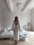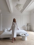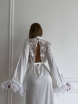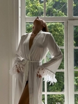Розкішні довгі халати з мереживом та пір’ям.🤍Виглядають дуже вишукано та ідеально підходять як для ранкових зборів нареченої, так і для елегантного домашнього образуШикарна мереживна спинка з фігурним вирізом – легкий акцент на спокусливістьПір’я на рукавах – грайлива деталь, що робить образ особливимТоненька атласна тканина приємна на дотик