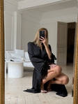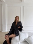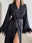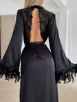 Розкішний довгий халат з мереживом та пір’ямВиглядають дуже вишукано та ідеально підходять як для ранкових зборів нареченої, так і для елегантного домашнього образу. Шикарна мереживна спинка з фігурним вирізом – легкий акцент на спокусливість.Пір’я на рукавах – грайлива деталь, що робить образ особливим.Тоненька атласна тканина приємна на дотик.